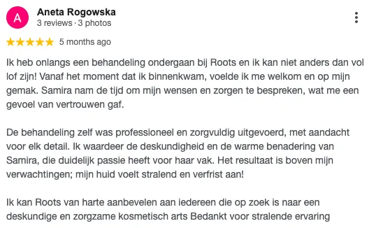 Bij Roots Clinic helpen wij onze cliënten hun schoonheidsdoelen te bereiken, terwijl we hen een gevoel van luxe en verwennerij geven. Onze waarden zijn professionaliteit, vriendelijke service en het leveren van échte resultaten.